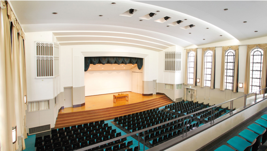 大阪女学院の中心に位置するヘールチャペル。毎朝の礼拝はここで行われます。 歴史ある建築物でありながら、大型スクリーンやプロジェクターなど付帯設備も充実しており、年間を通して様々な行事や催しも実施されています。