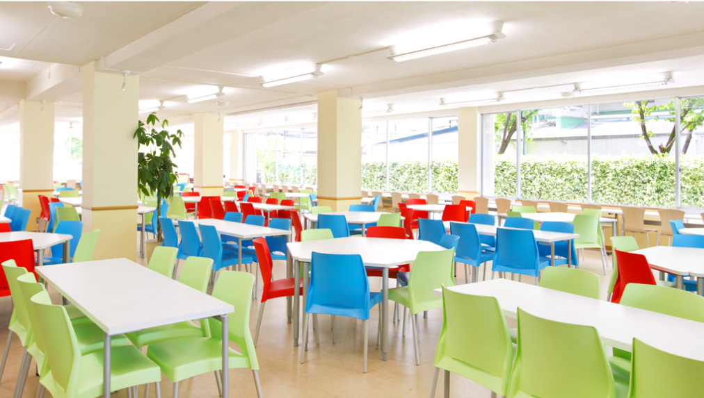 中高生だけでなく、大学生や教職員も利用できます。定番メニューに加え、日替わりランチやデザートなどの多彩なメニューで、生徒たちの健康を支えています。特に毎朝厨房で焼き上げる特製の手作りパンの風味は格別で、種類も豊富です。ガラス張りのスペースは外光がふんだんに入る明るい空間です。