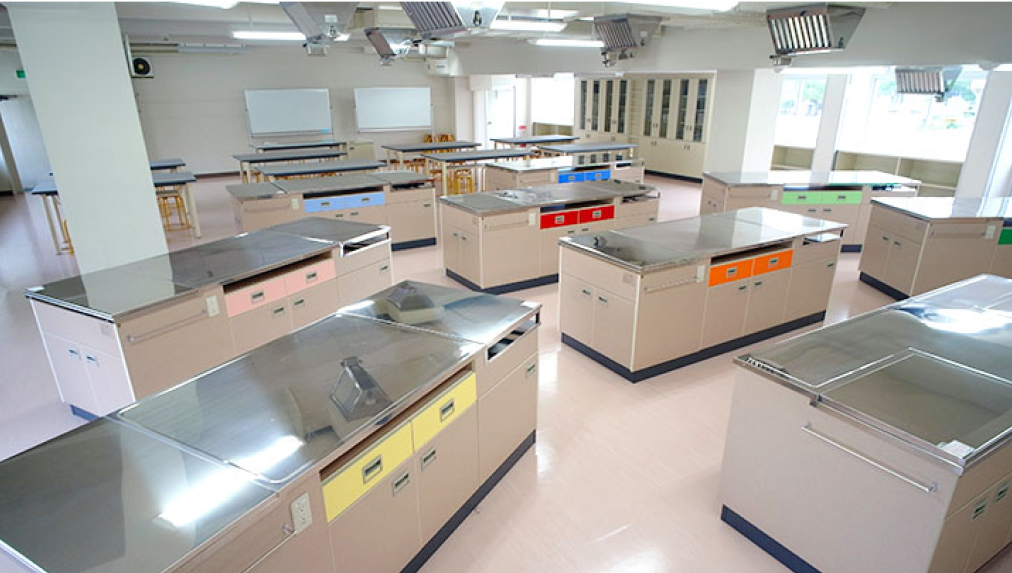 調理実習室には薪を利用して焼くピザ釜があります。調理台は女学院オリジナル。調理の後は、広々としたテーブルで楽しく試食します。被服実習室では、被服実習の他、技術の授業も行われています。