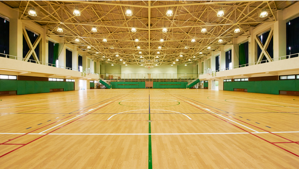100周年記念で全面改装された体育館。2020年度からはフローリングも最新のものに更新されました。体育の授業やクラブ活動など、生徒たちが日々汗を流して励んでいます。