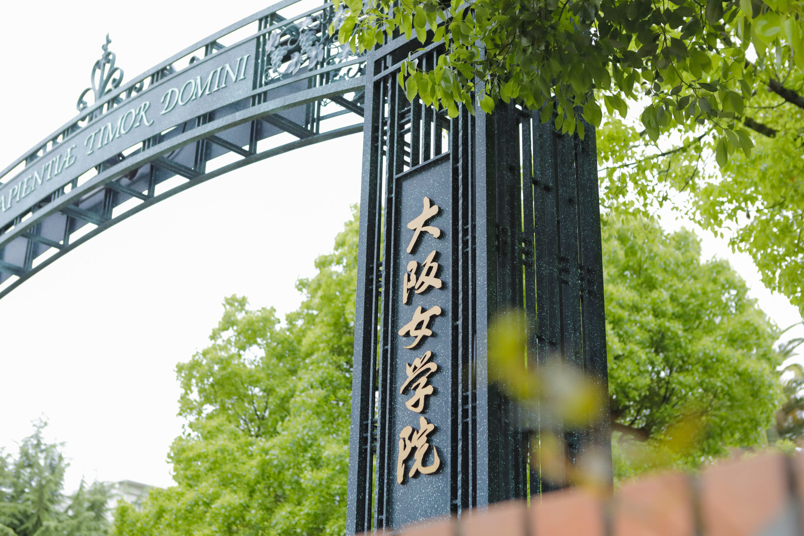 正門のアーチは、創立110周年記念事業の1つとして設置されました。聖書の言葉にちなんだ葡萄の葉と果実のモチーフが配され、イースターの花とされている百合もデザインされています。アーチ外側にはラテン語、内側には英語で次の聖句が記されています。 「主を畏れることは知恵の初め」(箴言1:7)