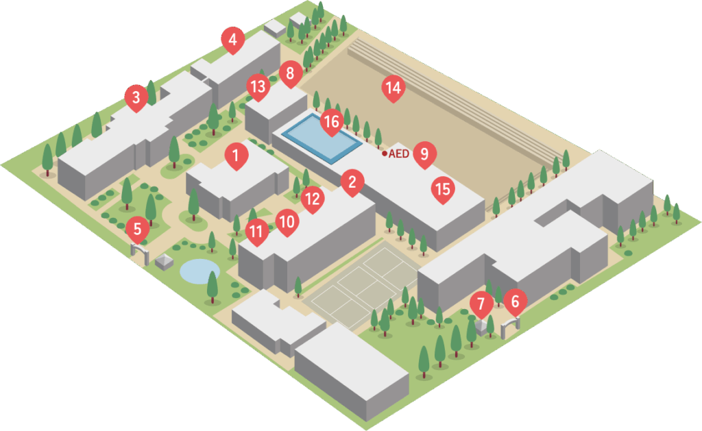 多くの木々に囲まれた緑豊かなキャンパスには、ヘールチャペルをはじめとした歴史ある建造物がたち並び、生徒たちの学びを支える充実した施設が設けられています。また、校内はバリアフリーで、各所に車イスで利用できるトイレやエレベーターが設置されています。