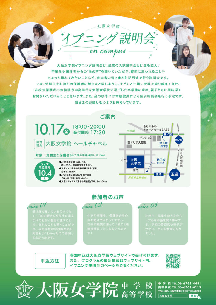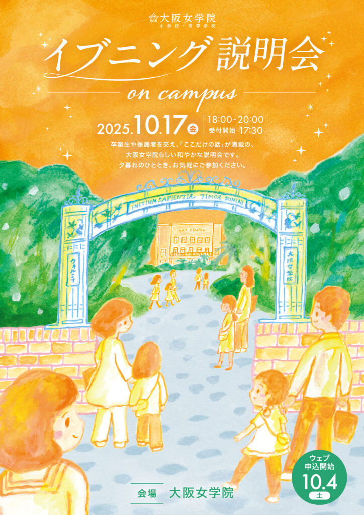 内容 | イブニング説明会 On Campus は、いつもの説明会とは少し趣を変え、夕暮れのキャンパスで行う和やかな会です。 いま、受験生がいらっしゃる保護者の皆さまと同じように、子ども達と一緒に受験を乗り越えてきた、在校生保護者の体験談や、大阪女学院で中高時代を過ごした卒業生と親しくお話しいただくことで、受験へのモチベーションや、学校生活のイメージに繋げていただけることと思います。もちろん、教員への個別相談も実施いたします。 若い卒業生や保護者も参加しますので、様々な角度から学校のことをお伝えできるのではないかと考えています。どんなに小さな不安、質問にもお答えします。 小さな会場ならではの和やかな会で、個別でのご相談にも対応いたしますので、お誘い合わせの上、どうぞお気軽にご参加ください。(お時間が合えばぜひ、お嬢様をお連れください) 皆さまのお越しを心よりお待ちしています! ※お飲み物と軽いお食事をご用意いたします。 |