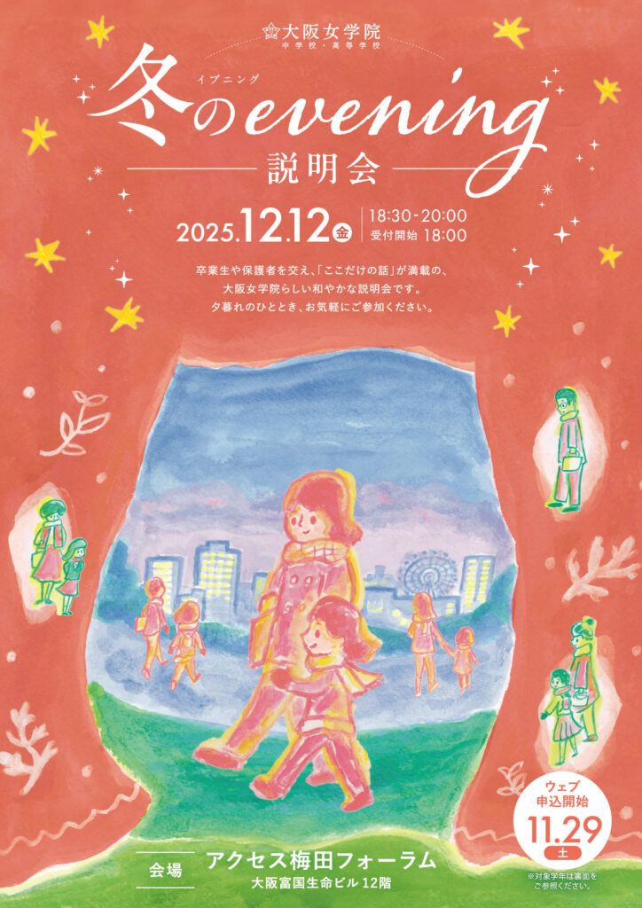 入力いただいた個人情報は今回の冬のevening説明会 梅田会場開催の目的のみに使用いたします。また、入力の際に本校の学校行事案内送付を希望された方には、文化祭、及び公開クリスマスほか、受験生向けイベント案内の郵便と、メールマガジンをお送りいたしますが、これを越えた利用はいたしません。