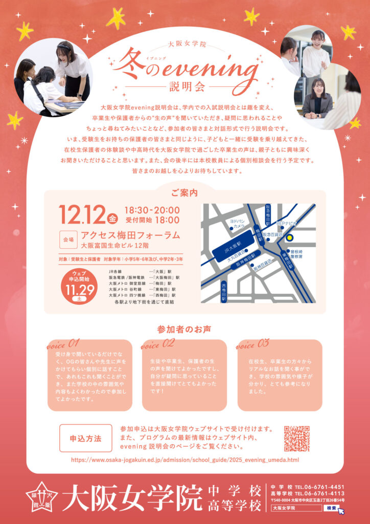 | 内容 | この説明会は、学内での入試説明会とは趣を変え、卒業生や保護者からの”生の声”を聞いていただき、疑問に思われていることや尋ねてみたいことなどにおこたえする、参加者の皆さまと対話形式で行う説明会です。 いま、受験生をお持ちの保護者の皆様と同じように、子どもと一緒に受験を乗り越えてきた、在校生保護者の体験談や入学されてからの話しや、中高時代を大阪女学院で過ごした卒業生の声は、興味深くお聞きいただけることと思います。また、会の後半には本校教員による個別相談を行う予定です。 |